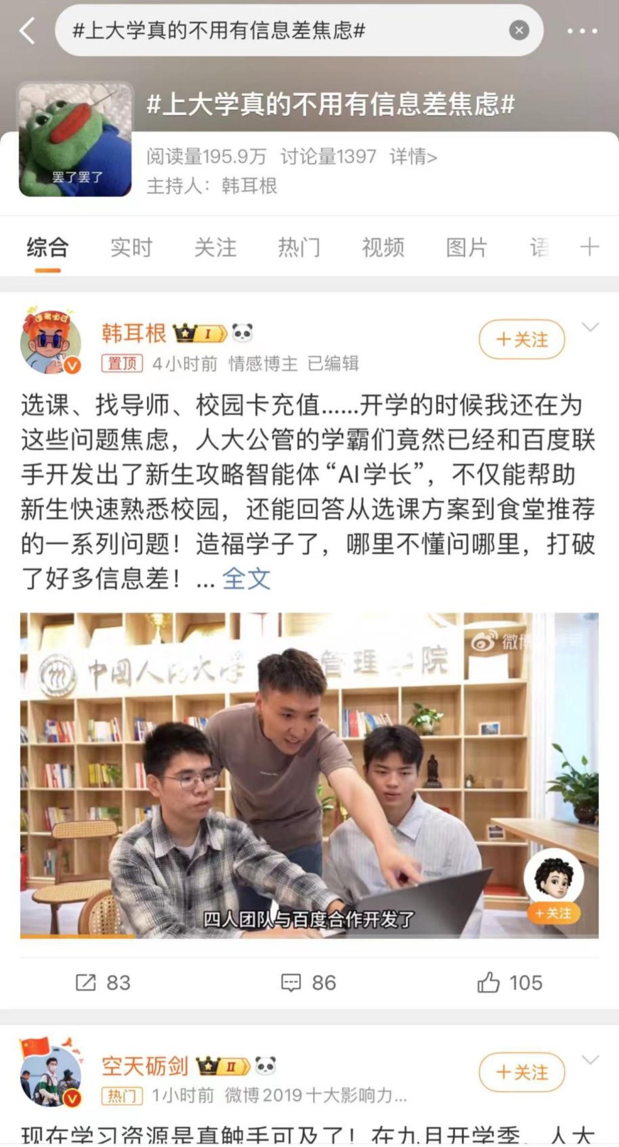 公共管理AI平台与百度AI公司合作,开发了“人大公管的AI学长”智能体产品,该项目覆盖从战略设计到推广的全流程,为学生提供了深入学习AI技术的机会,并帮助他们明确个人发展方向。此项目不仅在校内广受关注,还登上微博热搜,获得主流媒体报道,展现了技术与现实结合的潜力。