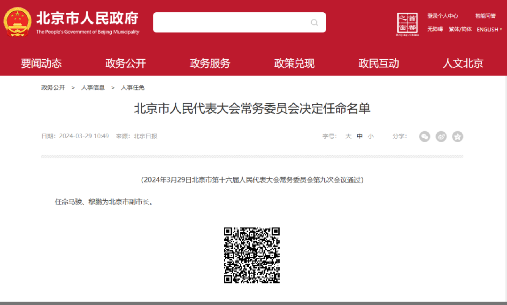 (2024年3月29日北京市第十六届人民代表大会常务委员会第九次会议通过)任命马骏为北京市副市长。