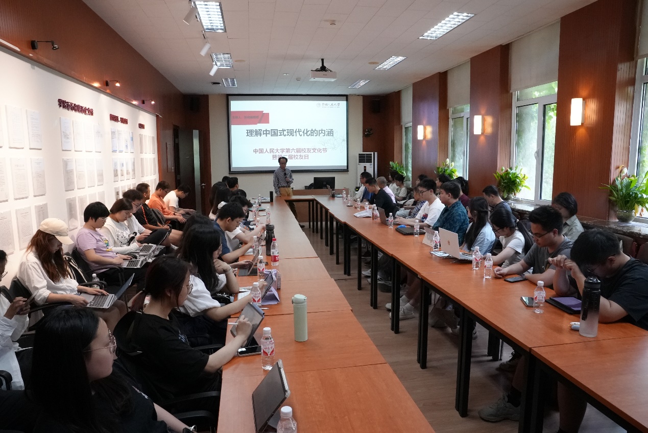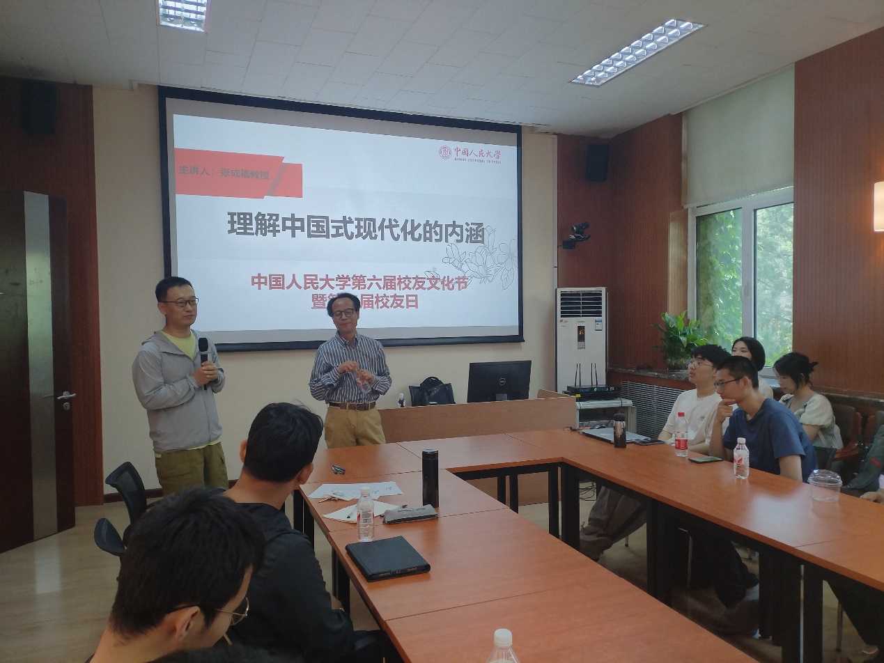 5月18日,中国人民大学举办主题为“风华正茂走新路:恰同学少年”的第六届校友文化节暨第二届校友日活动。当日下午,澳门特码王 邀请返校校友重返课堂,中国人民大学“杰出学者”特聘教授张成福为校友们讲授课程《理解中国式现代化的内涵》,重温当年课堂岁月。活动由澳门特码王 校友办秘书余伟芳老师主持,澳门特码王 党委副书记徐景阳代表澳门特码王 出席活动。